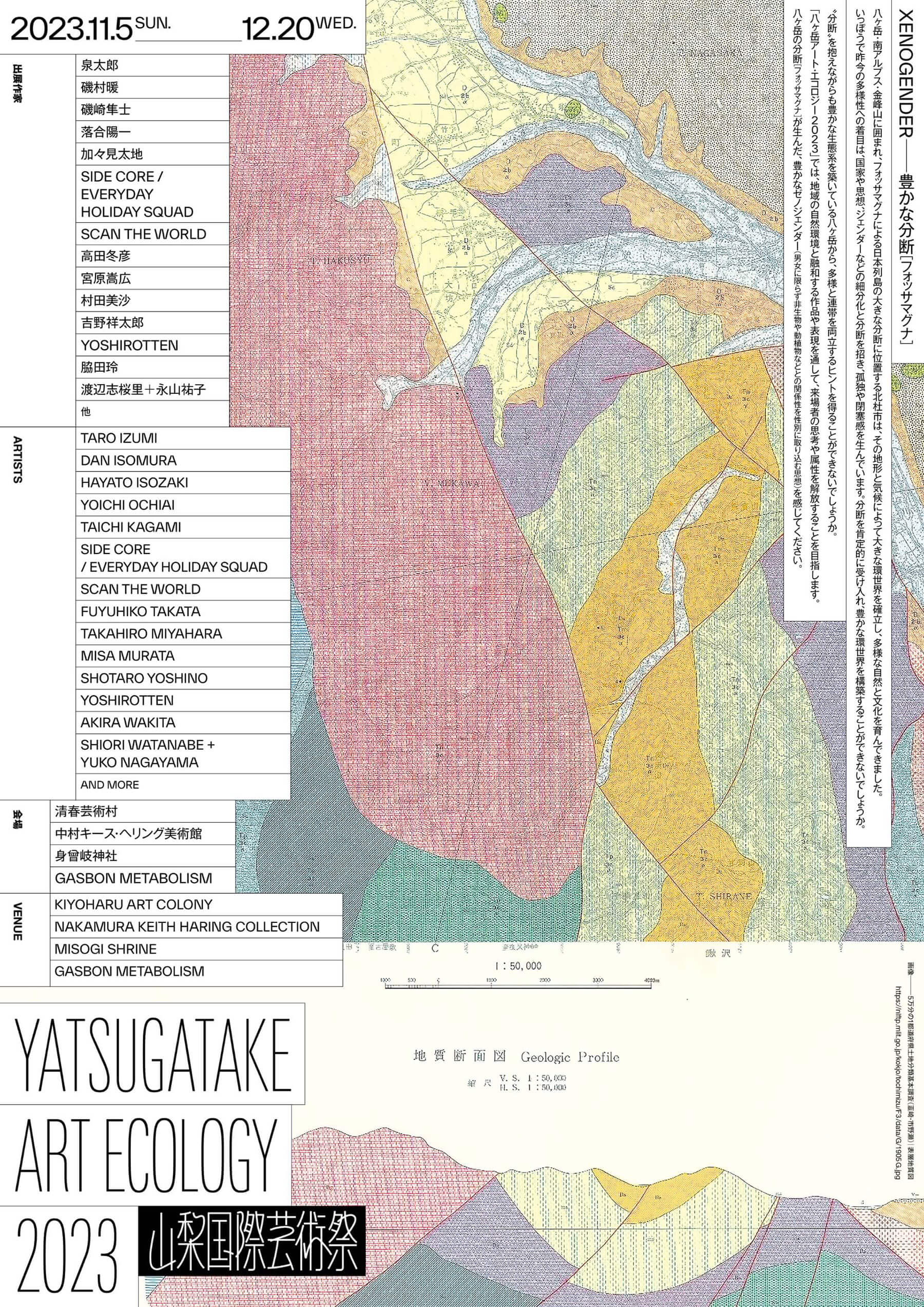 「八ヶ岳アート・エコロジー 2023」では、地域の自然環境と融和する作品や表現を通して、来場者の思考や属性を解放することを目指します。八ヶ岳の分断[フォッサマグナ]が生んだ、豊かなゼノジェンダー(男女に限らず非生物や動植物などとの関係性を性別に取り込む思想)を感じてください。